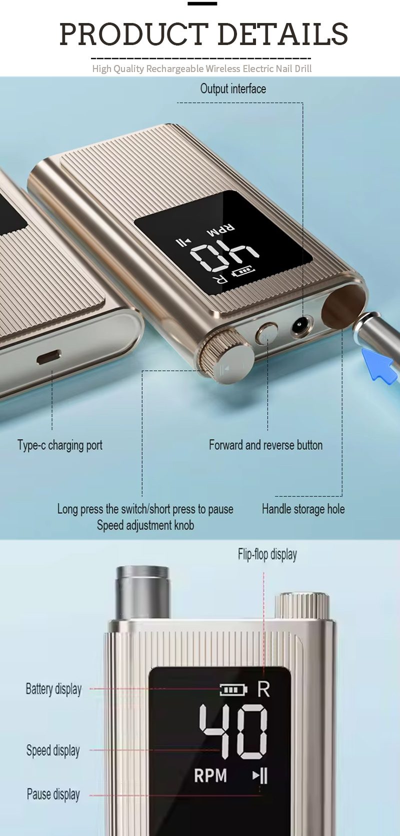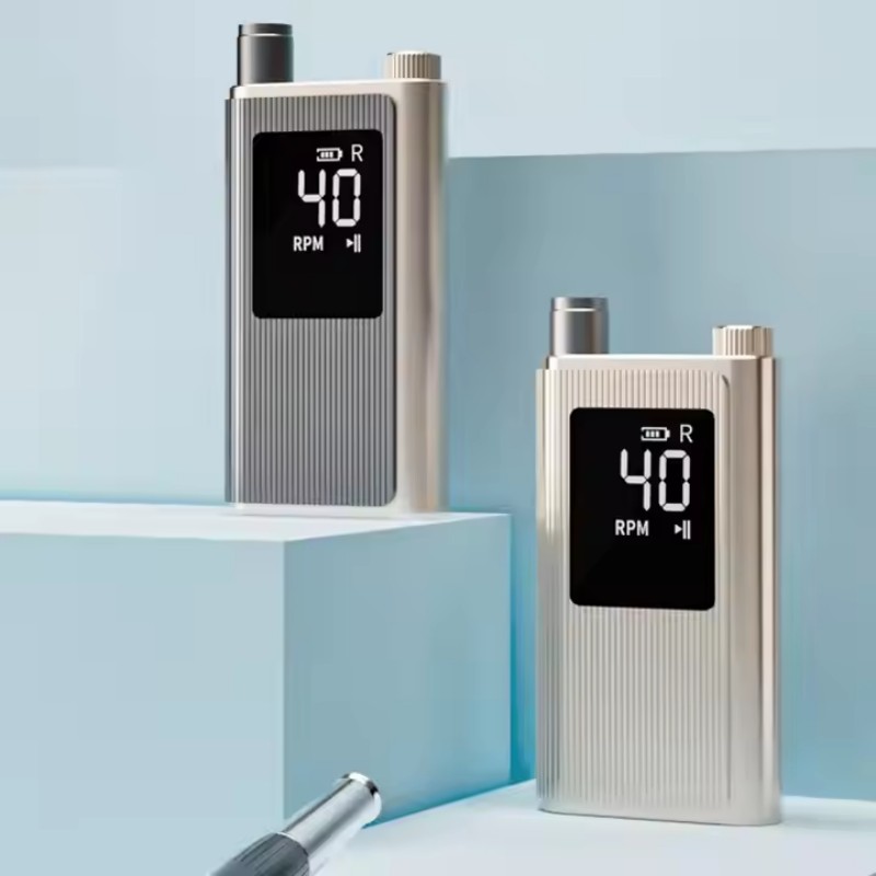 Bu 40.000 rpm yüksek hızlı profesyonel çivi matkabının ekran tasarımı, toplam tek tuşla etkinleştirme için bir açma/kapama anahtarına ve ileri/geri dönüşe, altta hızlı şarj soketine, üstte değiştirilebilir bir matkap soketine ve çeşitli ihtiyaçları karşılamak için üç konumda ayarlanabilir hıza sahiptir.
