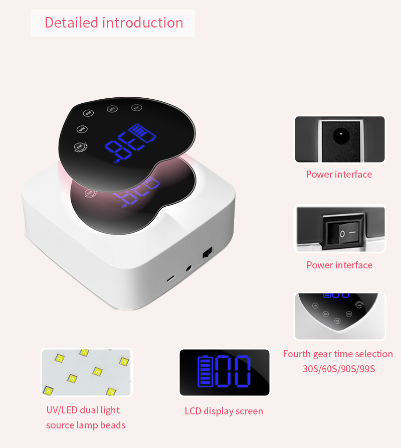 Ürün, büzülmeden tutkalın eşit şekilde kurumasını sağlar. Çift ışık kaynakları, ellerin renk solmasını ve göz yorgunluğunu önlemek için hafif bir ısıtma sağlar, hem eller hem de ayaklar için uygundur ve olağanüstü hızlı kuruma sonuçları sağlar.