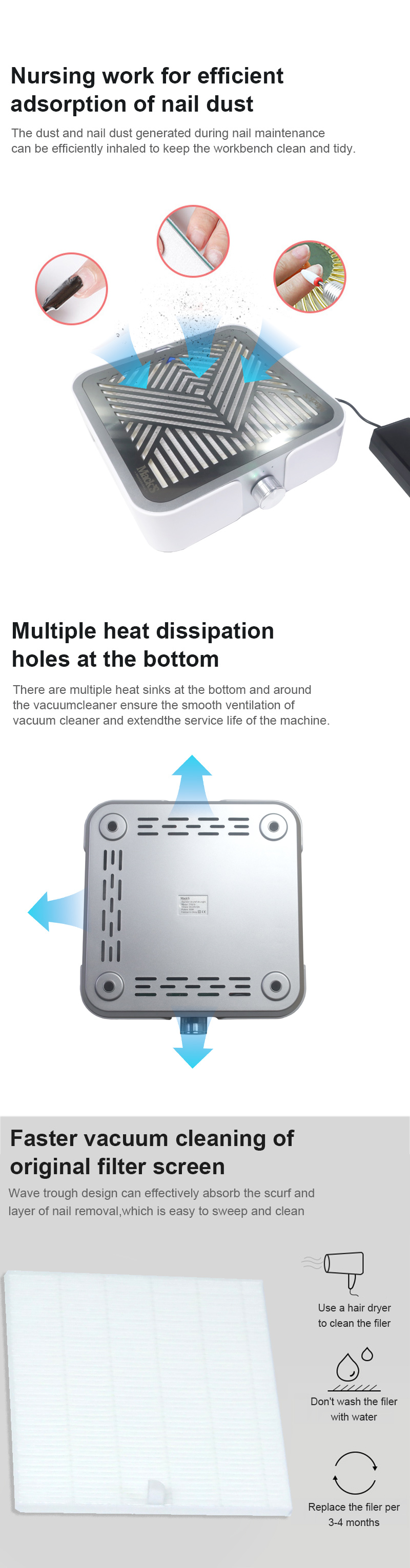 Ürünler tırnak kalıntılarını güçlü bir şekilde emer, toz sızıntısı yapmaz, tezgahı temiz ve düzenli tutar, hızlı süpürme toz sızıntısı yapmaz, yüksek güçte daha verimlidir.