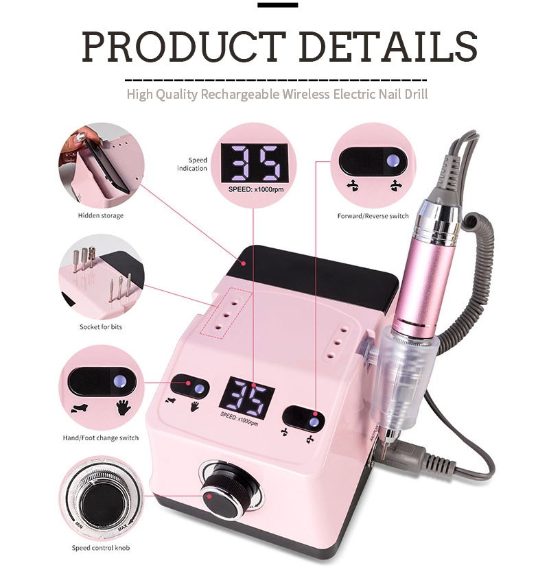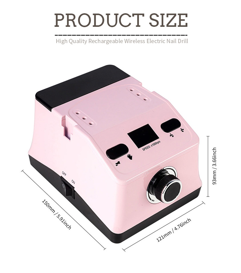 Bu el tipi tırnak matkabı ve parlatıcının ekran tasarımı, toplam tek tuşla etkinleştirme için bir açma/kapama anahtarına ve ileri/geri dönüşe, altta hızlı şarj soketine, üstte değiştirilebilir bir matkap soketine ve çeşitli ihtiyaçları karşılamak için üç konumda ayarlanabilir hıza sahiptir.