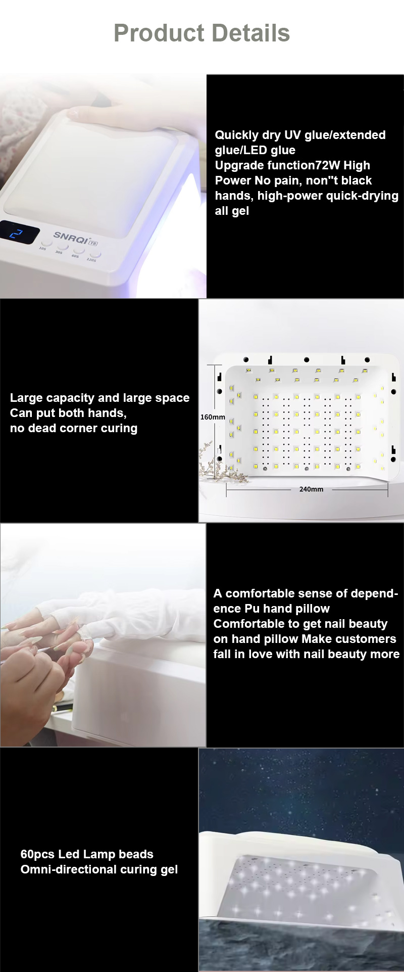 Ürün, büzülmeden tutkalın eşit şekilde kurumasını sağlar. Çift ışık kaynakları, ellerin renk solmasını ve göz yorgunluğunu önlemek için hafif bir ısıtma sağlar, hem eller hem de ayaklar için uygundur ve olağanüstü hızlı kuruma sonuçları sağlar.