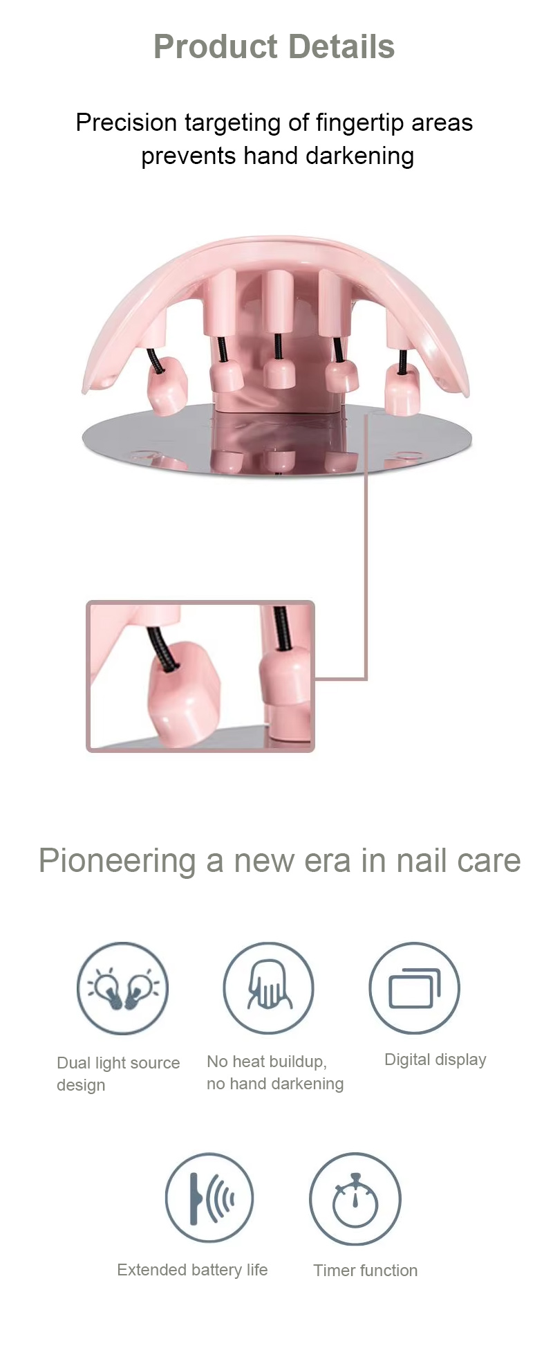 Ürün, büzülmeden tutkalın eşit şekilde kurumasını sağlar. Çift ışık kaynakları, ellerin renginin solmasını ve göz yorgunluğunu önlemek için hafif bir ısıtma sağlar, hem eller hem de ayaklar için uygundur ve oldukça hızlı kuruma sonuçları sağlar.
