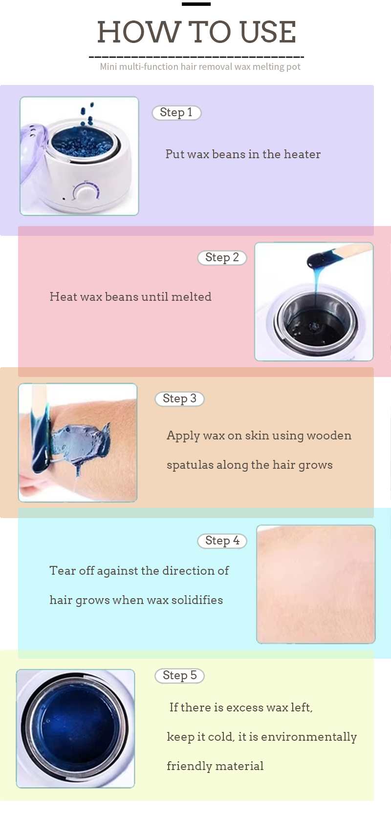 Ürün tüy dökücü ağda çalışma yöntemi, sıcaklık ne kadar yüksek olursa ağda o kadar hızlı erir, sıcaklık ne kadar düşük olursa ağda o kadar yavaş erir, önce uygun miktarda tüy dökücü ağda fasulyesi içine dökün, ağda çekirdekleri eriyene kadar ısıtın, daha sonra tekdüze kaplanmış tüy dökücü ağdanın tüy dökücü kısımları ve son olarak saç büyüme yönünün tersine yırtılır.