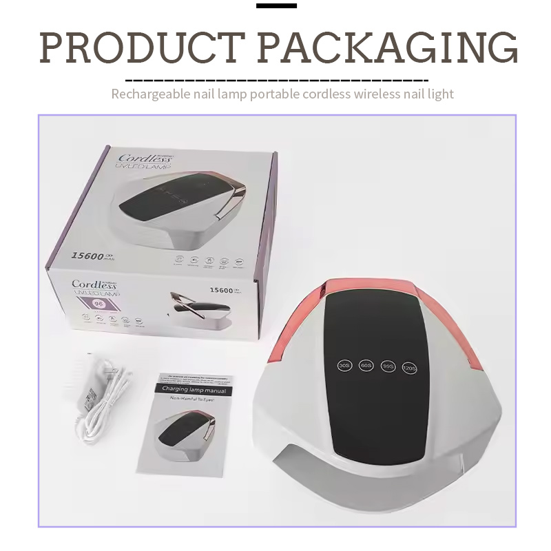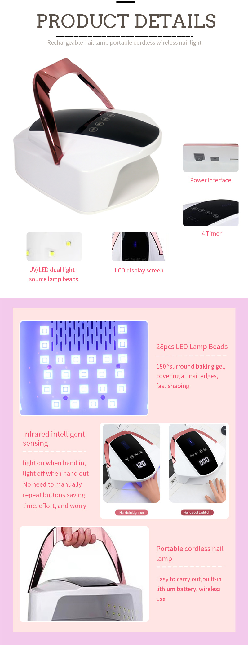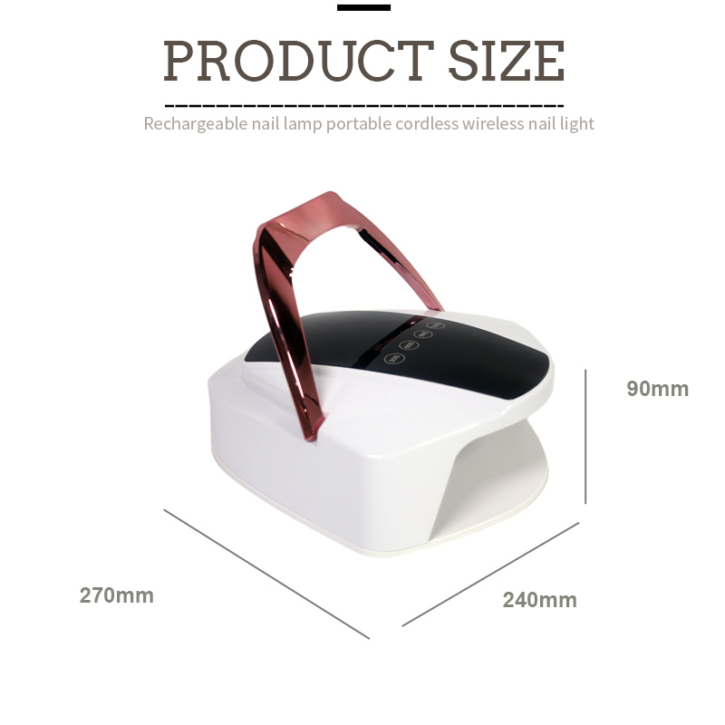 Şarj edilebilir oje lambası profesyonel sürüm 90W ürün görünümü bir oluk tasarımına sahiptir, tutamak yiğit taşınabilir bir sap rolü olarak kullanılabilir, bu da taşımayı ve koymayı daha uygun hale getirir. Ayrıca sapın kolayca kırılmasını ve gevşemesini de önler.